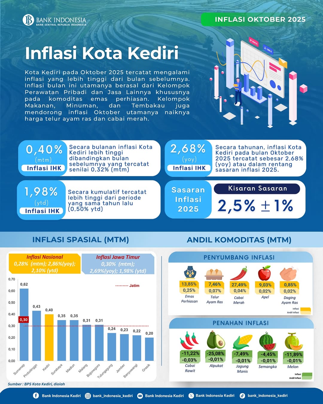 Secara umum, inflasi di ketiga wilayah kerja BI Kediri masih berada dalam kisaran sasaran inflasi nasional tahun 2025 sebesar 2,5 ± 1 persen.
