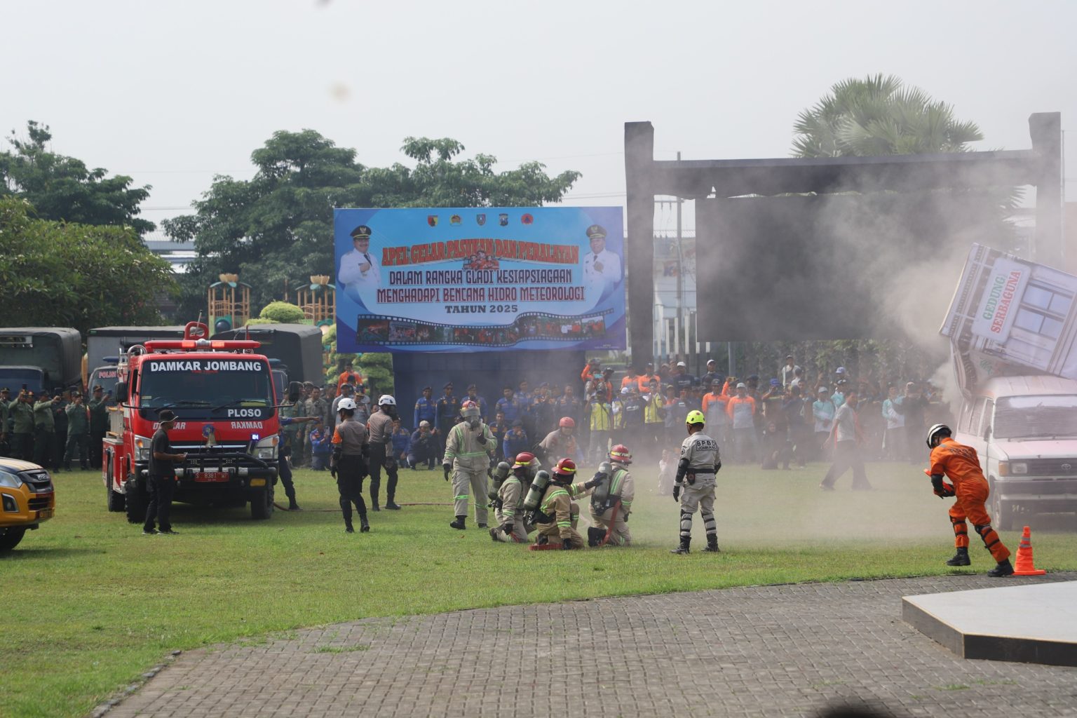 ADAKITANEWS, Jombang – Pemerintah Kabupaten Jombang melaksanakan Apel Gelar Pasukan dan Peralatan dalam rangka Gladi Kesiapsiagaan Menghadapi Bencana Hidrometeorologi 2025 di Alun-Alun Jombang. Kegiatan yang dipimpin Bupati Jombang, Warsubi, S.H., M.Si., ini menegaskan pentingnya mitigasi dan kesiapsiagaan menghadapi ancaman bencana di tengah meningkatnya intensitas curah hujan dan perubahan iklim.