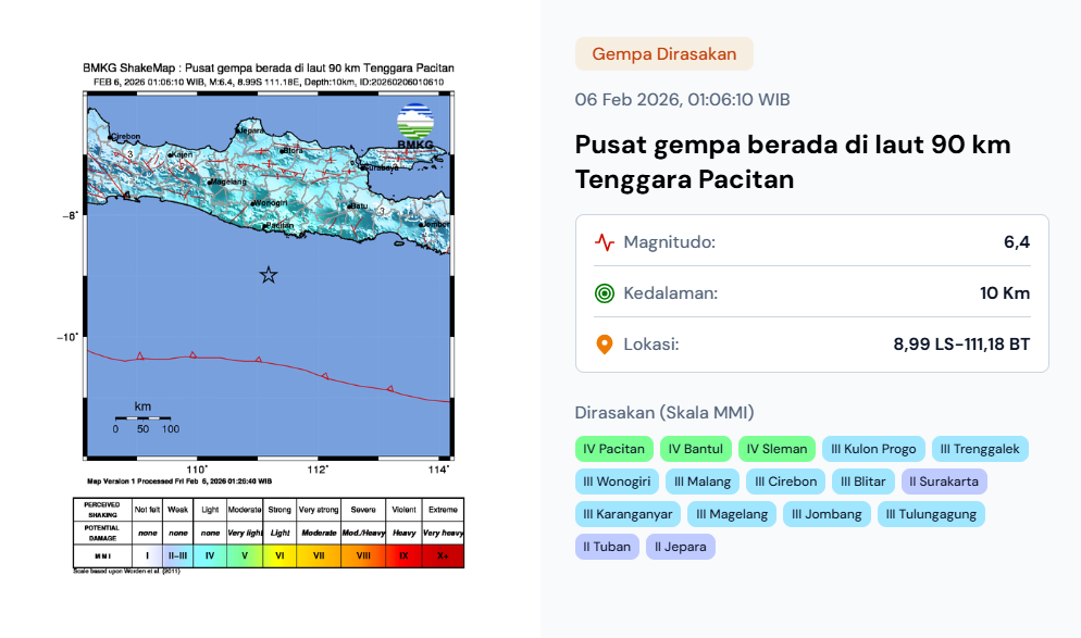 ADAKITANEWS, Pacitan – Wilayah selatan Jawa Timur diguncang gempa bumi tektonik berkekuatan Magnitudo 6,4 pada Jumat (6/2) dini hari pukul 01.06 WIB. Meski memiliki kekuatan yang cukup besar, Badan Meteorologi, Klimatologi, dan Geofisika (BMKG) mengonfirmasi bahwa gempa ini tidak berpotensi tsunami.