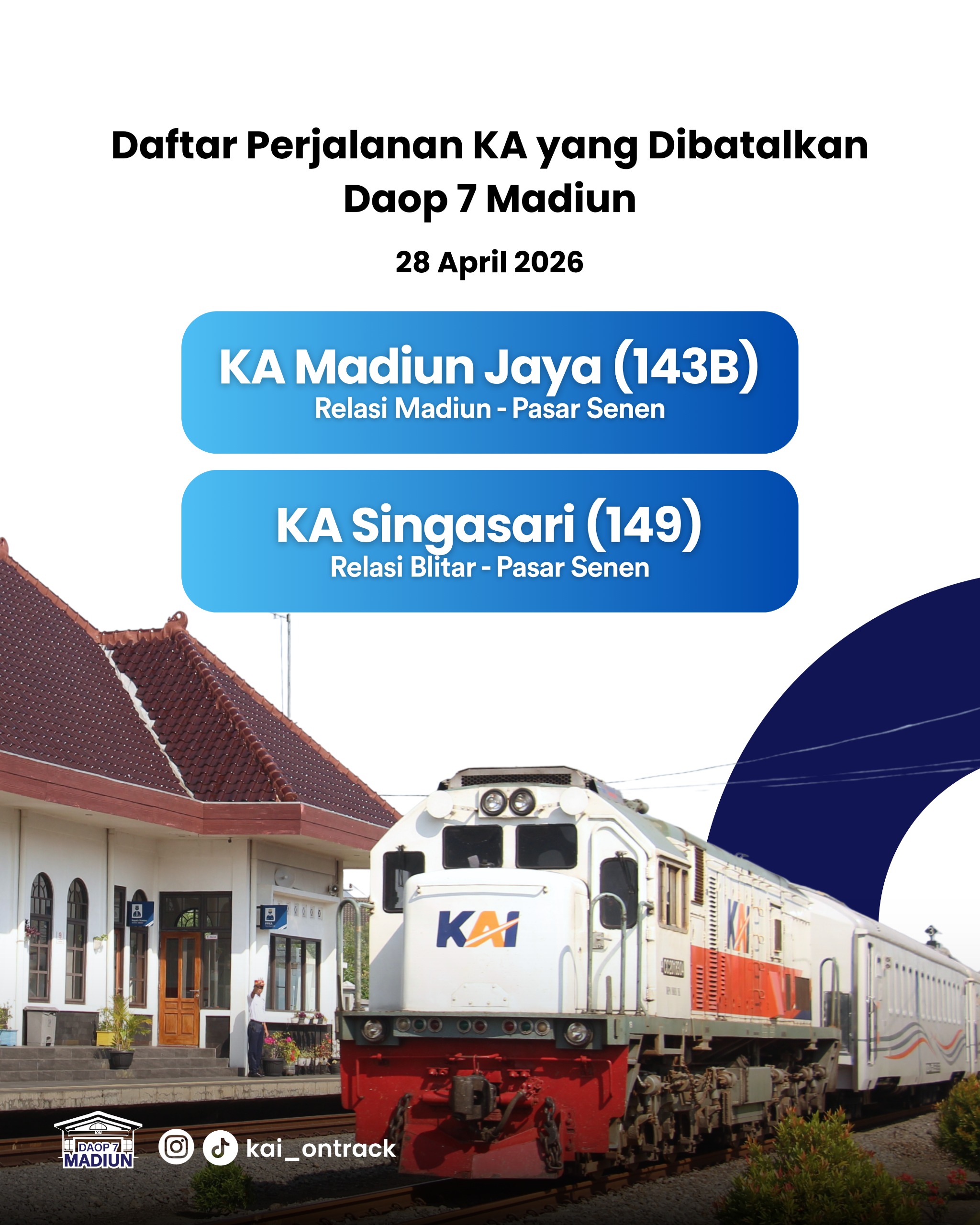 Hingga Selasa (28/4/2026), tercatat sebanyak 362 tiket telah berhasil direfund oleh pelanggan di wilayah Daop 7 Madiun. Jumlah tersebut meliputi 173 tiket KA 143B Madiun Jaya relasi Madiun–Pasarsenen dan 189 tiket KA 149 Singasari relasi Blitar–Pasarsenen yang perjalanannya terpaksa dibatalkan.